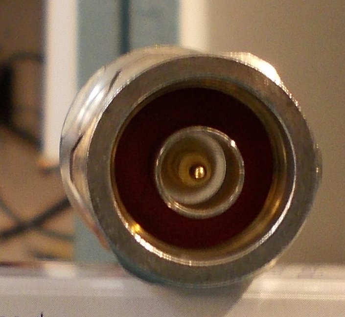 For example, the Cablewave Systems FLC 12-50 NM was evaluated here. It's a end connector for LDF-4 (50) type of copper jacked RF cable (50 ohms). The part number is 738802 which most likely is obsolete and no longer available (NLA) on the new market. However you may find some New Old Stock (NOS) on line. The distinctive feature is the cable's center conductor does not require soldering. Instead it is pushed into a "female" part, inside the main body housing. Shown here is the components out of the package. Obviously the two items on the left are from the cable to be used. The Author confirmed the center conductor fit the "female" part plus this illustrates the flair of the outer conductor when it's put together.