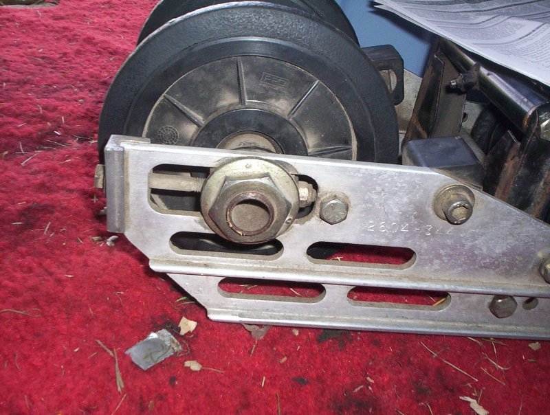 Front hole, located in foot well. Rear hole, located in tunnel support bracket. Now you can pull your suspension out carefully. Now that you have the rear suspension out we can work under the hood. Start by removing your hood, pipe, can, and clutches. (dont have to do primary, but it gives you more room... Now, on the can side, begin by draining the chaincase. Pictured in the diagram, #11 is a drain plug located inside your tunnel just below the driveshaft. Undo this bolt and drain the fluid, or you can drain it by removing your chaincase cover. there should be 6 1/2" bolts holding it on. Put a rag under it to catch the oil. Unscrew the 9/16" chain tensioner bolt approx 1/2" so the chain is nice and loose. Lock your brake on and unscrew the 3/4" nuts that hold the 2 gears on. Note the bottom gear and that the flat side is out, the other side has a "nub" on it... as pictured in 2nd pic. Pull the gears and chain off. Now you can take the bearing cup and o-ring off by unscrewing the 3 1/2" nuts that hold it on. Now, on the clutch side, remove the 3 1/2" nuts that hold the speed sensor on and carefully tap the bolts out and pull the speed sensor off to the side. Grab the driveshaft from underneath the sled and wiggle it so that the shaft comes out of the clutch side and into the chaincase, you can angle it and gently tap the bearing off the end of the chaincase side of the shaft and take the driveshaft out at an angle. You can now take your track off. When putting a track on, make note of the arrows on the track as to which direction it was designed to spin and set it under the sled with them facing in the correct direction.